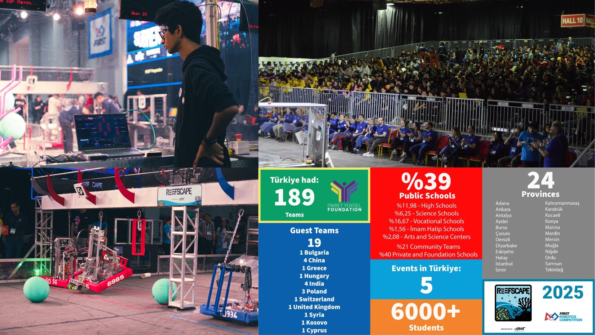 Fikret Yüksel Foundation successfully hosted five FRC Regionals in Istanbul and Ankara this season, welcoming 189 teams—including 19 international teams from 11 countries—and reaching over 6000 students. For the first time, two events ran simultaneously in Istanbul, doubling the excitement and engagement. Türkiye also became the fastest-growing FRC country worldwide with a 37% growth rate. As a historic milestone, 27 FRC and 3 FTC (FIRST Tech Challenge) teams earned invitations to the FIRST® World Championship in Houston, to proudly represent Türkiye on the global stage.
